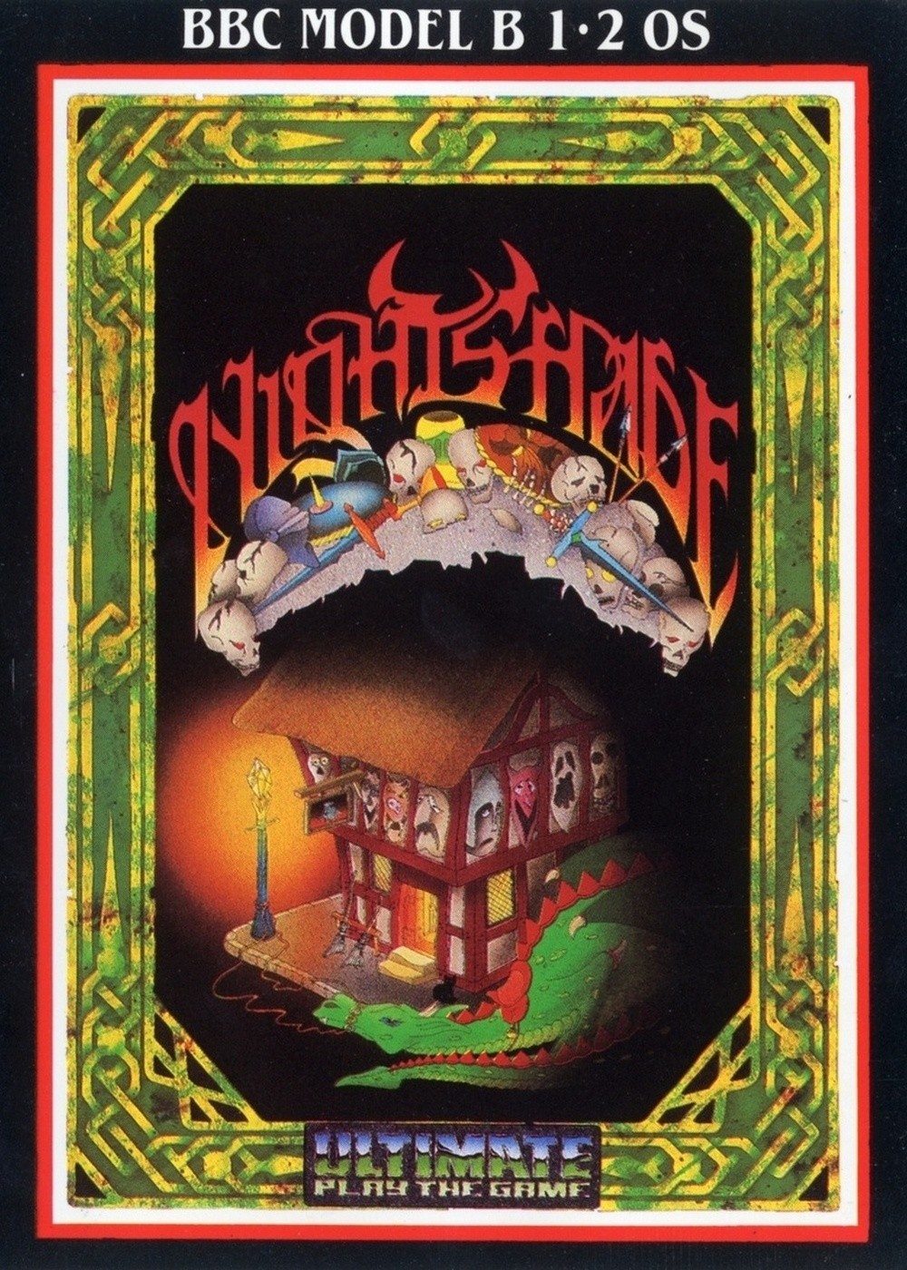Nightshade was released for the BBC Micro in 1985 by Ultimate Play The Game. It was the first game using the Filmation II graphics engine. The new engine allowed scrolling around a large world and arcade-like play, rather than the room-based puzzles of the earlier Filmation titles The BBC version is quite a bit different from the other formats, firstly the game is totally monochrome, usually blue, secondly the ammunition bar is under the play screen instead of by the side of it, this is because the play area is considerably larger than any other port, it also plays faster, and has the annoying quirk of enemies materialising on top of the hero removed. There is no joystick control and no way to redefine the keys to the players liking.