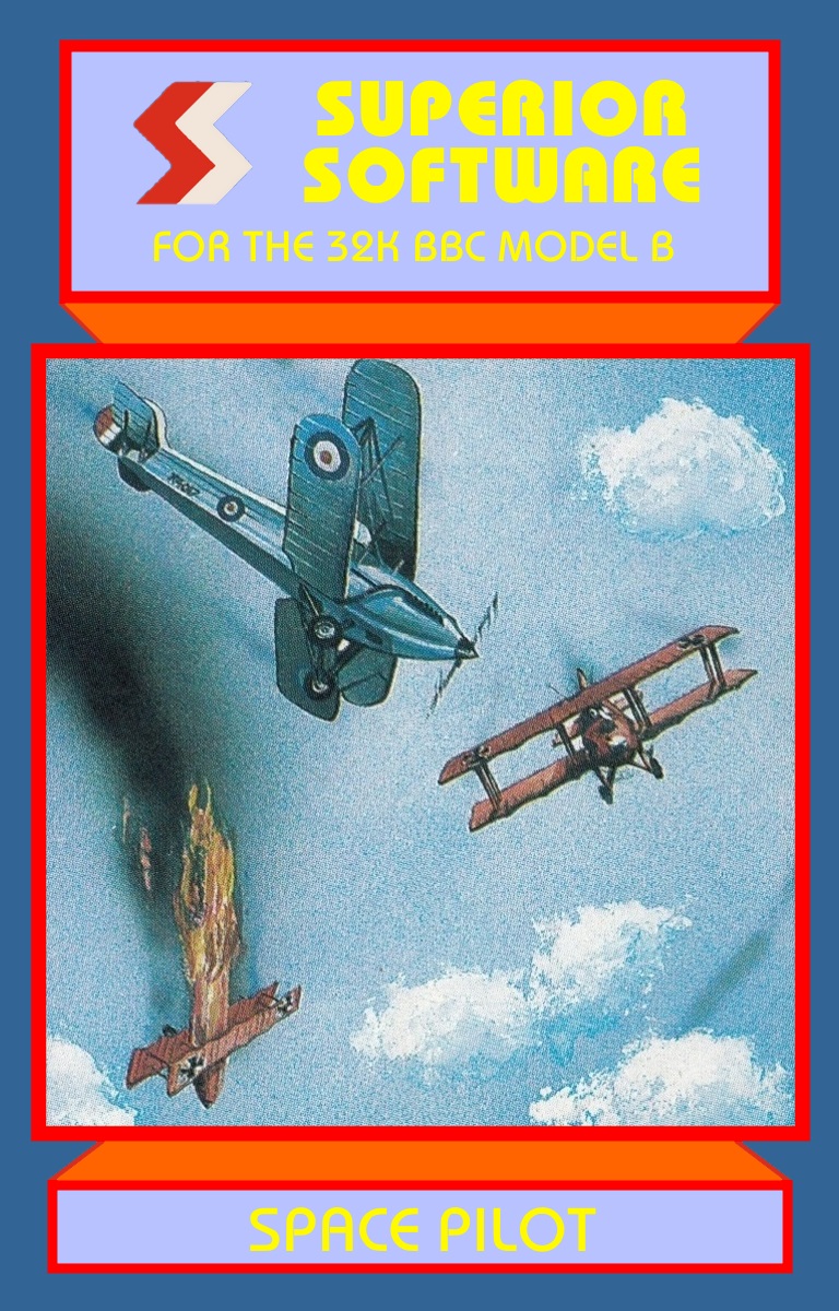 Space Pilot is a clone of the classic Konami game Time Pilot and was developed independently from the contemporary C64 game of the same name with similar gameplay. Players command an aircraft through different environments, shooting down planes to collect points. The ship's nose can be rotated left or right, so the craft can move into any direction and take sharp turns left or right. Speed is not controlled by the user and it is always maintained at the same level automatically. The background is wrapped endlessly both horizontally and vertically, and that way it is impossible to encounter a border. The game takes place in five time periods: 1916, 1940, 1970, 1984 and 1999. Each level holds different types of enemies, from classic biplanes to spitfires, helicopters, jets and UFOs. In each scene the player needs to shoot eight regular planes to decrease an icon bar of planes in the top left corner. For every icon that disappears a sound is played and a new squadron arrives. Once all the icons are gone a large boss ship appears and it takes multiple hits to destroy it. After taking it out the plane travels through time to a new period. The player's aircraft has an unlimited amount of bullets. Enemy planes have bullets too, but some of them can also drop bombs or fire homing missiles. In certain environments paratroopers with a red cross appear, these can be collected for bonus points. There are four lives in total before the game is over, but for every 10,000 points a new life is granted. No more than five lives can be held. When all time periods have been completed, the cycle of the five scenes is restarted, but the score is kept.