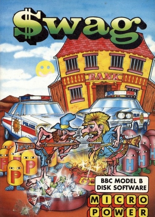 Swag is a 1 or 2 player video game developed by Dave Herbert and published by Micro Power for the BBC Microcomputer in 1983. You are out to steal £250,000 in diamonds before your rival. You accomplish this by collecting the heaps of diamonds which appear on the screen, and taking them to the cache in your house. Unfortunately, the other robber is not your only problem. There are several killer droids, employed by one of the insurance companies, who try to apprehend bandits such as yourself and recover the swag. There are two types of the droids Henrys and Percys. One type will try to catch you, the other your opponent. You can "convert" one which is following you by shooting it. You can also shoot the other player's man, and if caught by a droid or shot you will drop your swag and be returned to your house. Naturally, you will soon use up all the ammunition in your gun, but you can get more by depositing gold in the bank. The other way to convert droids is to move onto a "DH", which changes all Henrys to Percys, and vice versa. Moving onto a Smiley has the effect of sending your opponent back to his house. If you shoot a police car, it will follow you around the screen, which gives points to the other player, though you can stop this by drinking a can of beer (the sort which refreshes the parts other beers can't) and shooting them again.