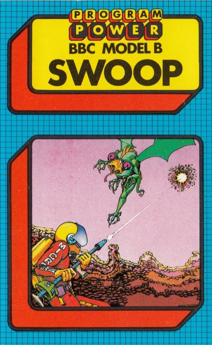Developed by David Elliot and published by Micro Power (aka Program Power), Swoop is a Galaxian style game in which you have to destroy the homing, swooping birdmen. There are eight phases to the game, each one being harder than the previous one. In the most difficult, you have to combat two bomb-dropping birds at once, as well as eight bombs dropped from the birdmen hovering overhead. If a birdman gets past you, he lays an explosive egg on your laser-base track, thus restricting the room for manoeuver. The eggs self-destruct as you score more hits, but as the game progresses a higher number is required before an egg disappears. A bonus base is awarded each time you clear two sheets.