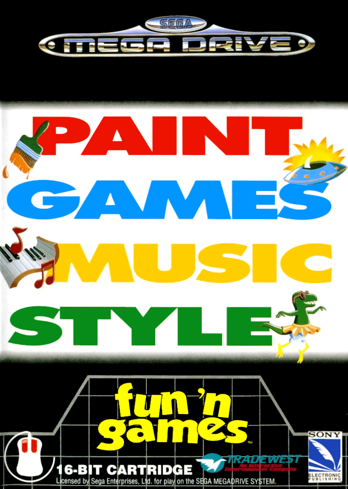 Fun 'N Games presents a mixture of games and "applications". The main menu is divided into four sections: Paint: A paint program that offers different tools and brushes, a few pre-made backgrounds and objects as well as the option to import figures that were created in the sub-games 'Stylin' Stuff' and 'mix 'n match'. Games: Mouse Maze: A Pac-Man-clone in which the player guides a mouse through a top-down labyrinth. To complete a level, all cheese symbol have to be collected while cats have to be avoided. Collecting a bone temporarily transforms the mouse into a dog that can kill the cats. Space Lazer: A shooter seen from the cockpit of a space-ship. The player controls a crosshair and has to shoot increasingly difficult enemies. Whack a Clown: This game is exclusive to the Genesis Version and plays like 'Whac-a-Mole' only with clowns instead of moles. Music: Songs can be composed by choosing from several instruments and putting notes onto a stave. It is also possible to add sound effects (animal noises and others) or edit provided songs. Style: This section contains two mini-games: Stylin' Stuff: Here, the player can edit the sprite of a woman by selecting different clothes, hats or haircuts. mix 'n match: Sprites can be created by putting together different heads, torsi and legs.