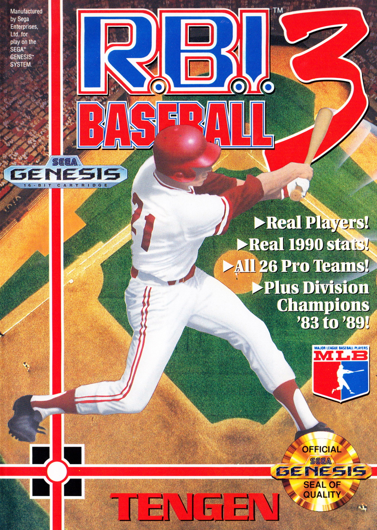 R.B.I. Baseball 3 took the popular baseball series a step further statistically, adding each Major League Baseball division winning team from 1983-1990, in addition to the 1989 All Star teams and all 26 1990 teams (with full 1989 statistics). Want to see how the 1986 Mets might have done against the 1987 Twins? Here's your chance. The game was licensed by the Major League Baseball Players' Association; thus, real Major League players and statistics are included, but the teams themselves are represented only by their home cities. Team names are not used. Also, retired players who were no longer under contract with the MLBPA in 1991 are not present. Rather, they are represented by their initials and their fielding positions. Game mechanics remain unchanged from R.B.I. Baseball 2, focusing more on arcade fun than realistic gameplay.
