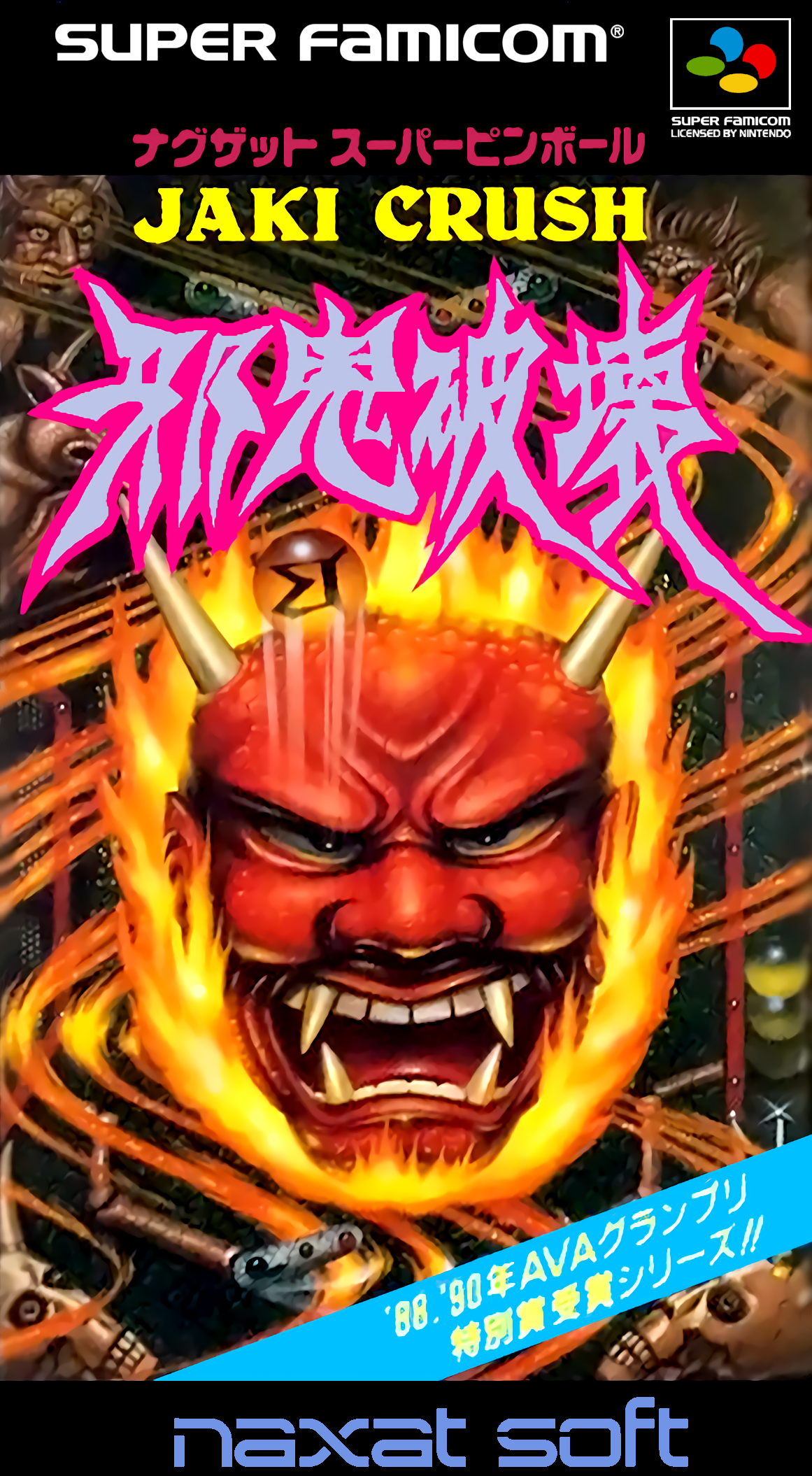 Jaki Crush is a pinball video game for the Super Famicom that was originally released in 1992, exclusively in Japan. The game is the third in the Crush Pinball series, and was preceded by Alien Crush and Devil's Crush. It is considered to be very obscure and is often thought to be the forgotten entry in the series. The game features a theme revolving around the mythology of a type of Japanese demon or ogre, called a jaki. A single table is divided into three different sectors; carrying two flippers each. Moving targets must be hit for points along with targets that remain stationary. Shooting the ball into the demon's mouth allows players to access up to six bonus levels.