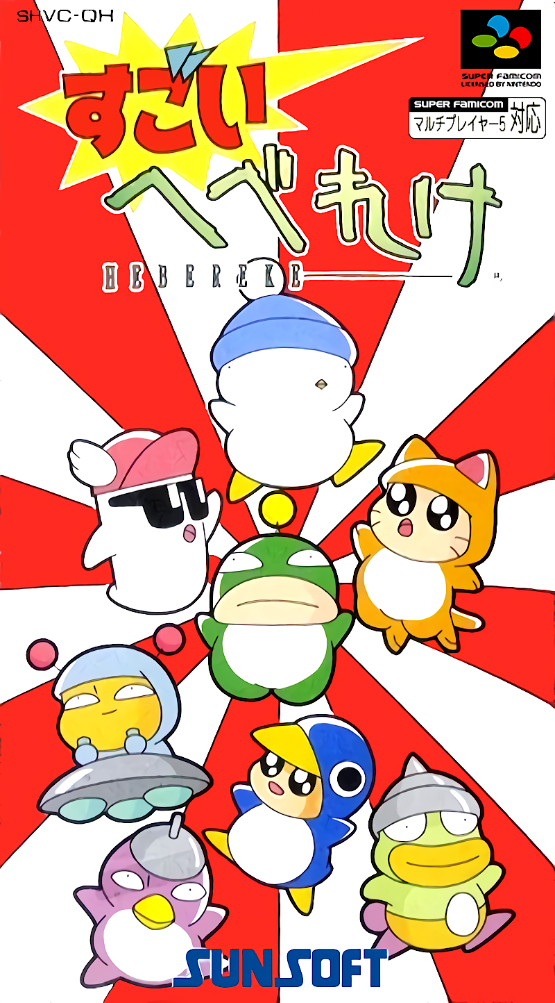 Sugoi Hebereke ("Amazing Hebereke") is a 1994 competitive multiplayer arena fighter and a spin-off of the usually more puzzle-focused Hebereke series. Hebereke and his friends take to a number of different arenas to brawl each other. Upon being defeated, the character turns into one of the "Popoons" of Hebereke's Popoon (a Puyo Puyo inspired puzzle game). Each arena is depicted from a top-down perspective and has a mix of native obstacles and items that are carried into the arena by smaller "helper" characters. These items can make a character stronger, recover their health or even sabotage them. Sugoi Hebereke features Hebereke (penguin), Oh-Chan (girl in cat suit), Sukezaemon (ghost with shades), Jennifer (big-lipped frog), Boo (purple bird), Utsu (alien in cat suit), Pen (boy in penguin suit) and Unyo (alien wearing a helmet). Each has their own array of basic attacks.