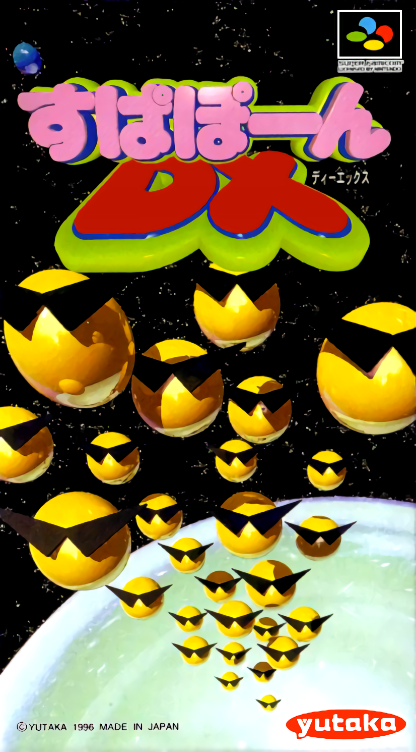 Supapoon DX is a puzzle game for the Super Famicom that takes the blueprint of the "block-breaking" genre and adds various new elements to it, such as a living block that can provide additional power to the ball. The goal of the game is to clear the screen of the shades-wearing yellow balls; the various crystals in the way don't have to be eliminated, but are often placed directly in the way. Supapoon DX is specifically an enhanced remake of 1995's Supapoon. It uses the same world map but features different levels and power-ups. It also includes an intro cutscene for the single-player game and, most overtly, introduces a competitive two-player versus mode. The two-player mode gives each player their own screen of blocks to eliminate, and various power-ups are meant to make the game more challenging for their opponent, such as an arrow that drops the opponent's blocks down a space.
