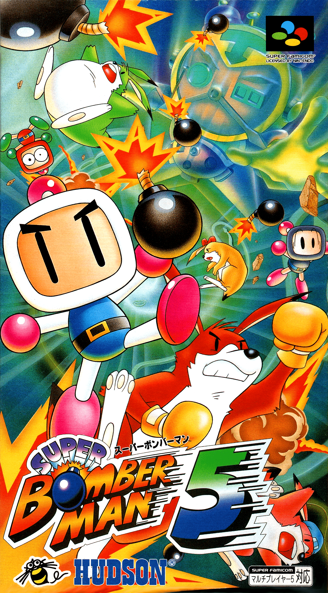 An evil Bomber named Emperor Terrorin who has the power of Time itself has freed various criminal Bombers from their prison cells in orbit around Planet Bomber. Setting them up in a warped time and space, Shirobon, Kurobon, and their Louie (Rui) companions must travel through stages and defeat them before going up against Emperor Terrorin himself. Super Bomberman 5 (スーパーボンバーマン5), released by Hudson Soft in early 1997, was the final Bomberman game released on the Super Family Computer - the Japanese version of the SNES. The game was released in two variations: a standard cartridge and a gold cartridge, which was sold exclusively through CoroCoro Comic. The gold cartridge included extra maps in battle mode.