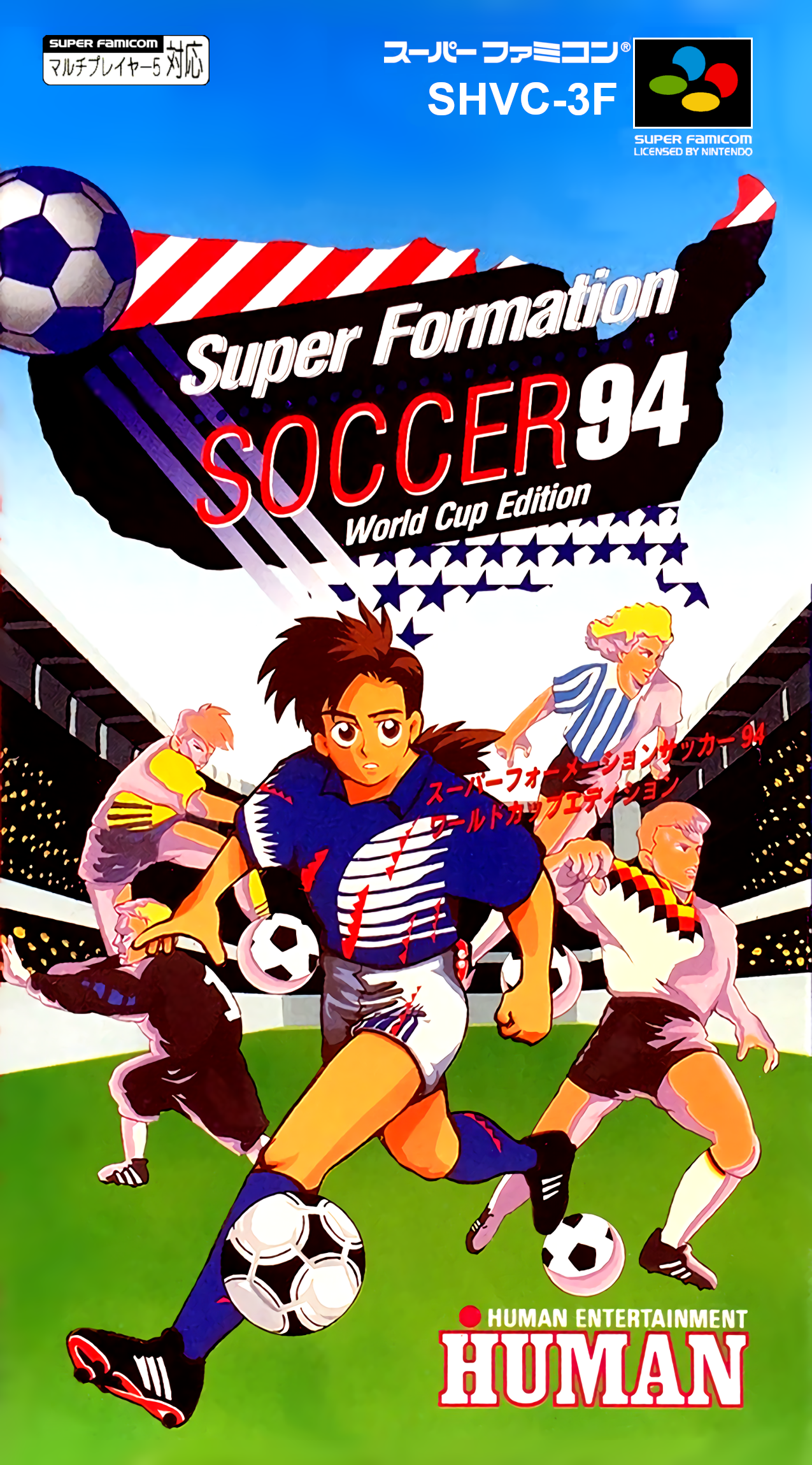 The third game in their Super Formation Soccer series. It is based on the 1994 World Cup event, held in the USA, and features the twenty four national teams that qualified that year. Japan, which did not qualify, replaces South Korea (which did) in the roster to appease the Japan-exclusive audience for the game. The game features alternate modes as well as a World Cup Mode, and in these modes the player can select other non-qualifying teams like England, Uruguay, France and Denmark. Super Formation Soccer 94 was re-released as the updated Super Formation Soccer 94 World Cup Final Data in September the same year.