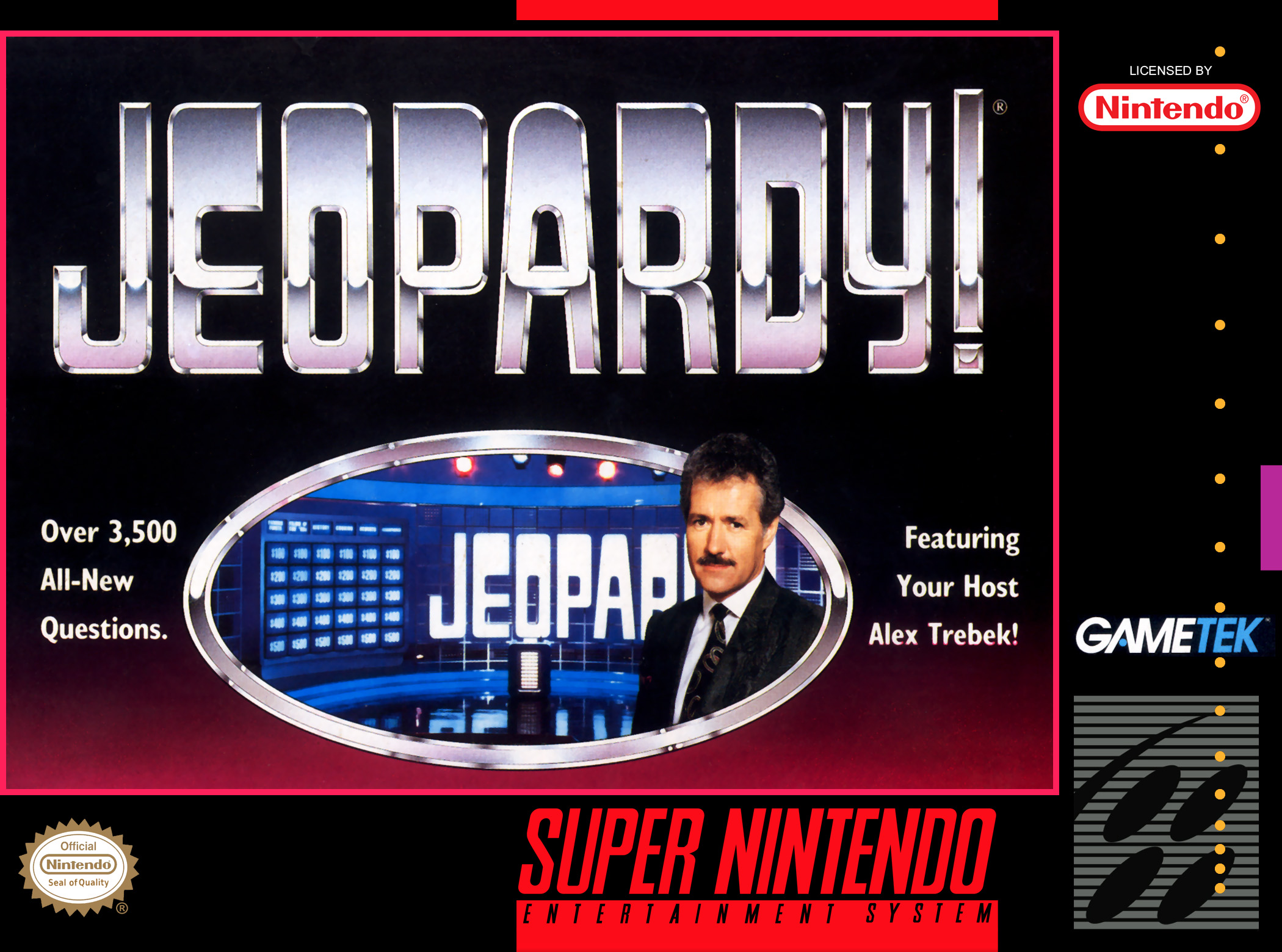 There is a fine art to watching Jeopardy!®, as any know-it-all could tell you. It used to mean shouting at the television (in question form) or turning to anyone within earshot, nodding and calmly saying "I knew that..." GameTek changes all that by giving Jeopardy! fans everywhere an opportunity to really buzz in. Alex Trebek hosts this all-new video game version of television's longest-running game show. Featuring the digitized television studio, theme music, voice and photography of Alex himself, this Jeopardy! takes full advantage of the graphic and sound capabilities of the Super Nintendo Entertainment System. With over 3,500 questions and answers (or is that answers and questions?), it's sure to last many seasons without re-runs. GameTek's Jeopardy!, is the smartest game available on the Super Nintendo Entertainment System.